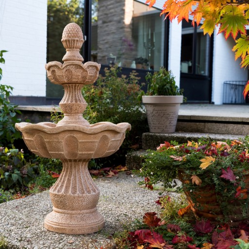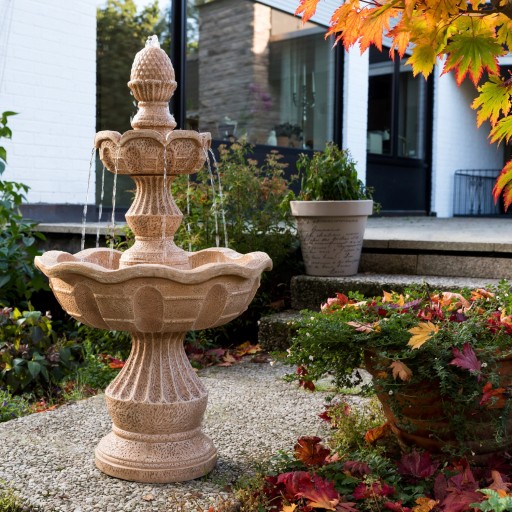 Fontanna ozdobna "METIS" na zewnątrz i do wewnątrz. Idealne na taras, do ogrodu i na balkon. Wymiary: dł. 58 x szer. 58 x wys. 102 cm miska duża: ø 58 cm, wysokość 58 cm, miska mała: ø 29 cm, wysokość 82 cm Pompa 230 V 12 W: - Standard IPX 8 (odpowiednia do użytku na zewnątrz) - Regulowana wydajność Woda w obiegu zawsze przepływa za pomocą płynnie pracującej pompy (nie jest konieczne podłączenie wody) Waga całkowita: ok. 20 kg bardzo łatwy montaż Kolor: piaskowiec Materiał: żywica poliestrowa
