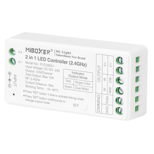 FUT036 to odświeżona wersja popularnego kontrolera FUT036. Kontroler LED został rozbudowany o zaawansowaną funkcję przekazywania i synchronizacji sygnału, co przy zachowaniu 30m odstępów pomiędzy kolejnymi urządzeniami, pozwala uzyskać nieskończony zasięg. Parametry pracy kontrolera synchronizują się automatycznie z innymi produktami znajdującymi się w grupie, pozwala to na uzyskanie identycznego efektu oświetlenia nawet wtedy kiedy produkty zostaną uruchomione w innym czasie. Moc kontrolera została zwiększona do 12A (144W przy instalacji 12V i 288W przy instalacji 24V). Wbudowaną dioda sygnalizacyjna, pozwala na szybką diagnozę oraz przypisanie kontrolera do pilota bez podłączania taśmy LED.