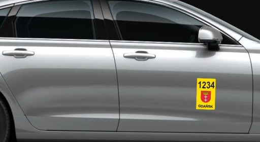 Oferta obejmuje komplet naklejek foliowych pozwalających oznakować zgodnie z przepisami taksówkę osobową: 2 x herb miasta z zaokrąglonymi rogami + komplet samoprzylepnych cyfr z czarnej folii do wyklejenia numeru licencji.