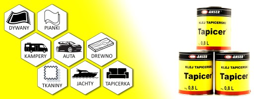 Klej TAPICER klei gąbkę poliuretanową, gąbkę poliestrową, tkaniny satynowe, filc, jutę, gumę meblarską, dywany itp. Posiada on bardzo dobrą wytrzymałość potwierdzoną przeprowadzonymi doświadczeniami, jako klej stosowany do podłoża betonowego, metalowego, drewna surowego i lakierowanego, płyt eternitowych. Wszystkie wymienione materiały można kleić we wzajemnych kompozycjach.
