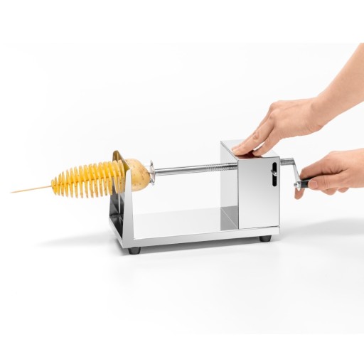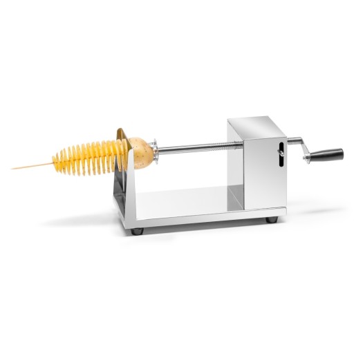 Maszynka do tworzenia zakręconych ziemniaków na patyku marki Forgast. Wytrzymała konstrukcja ze stali nierdzewnej. Maszynka posiada stalowe ostrze, 4 gumowe antypoślizgowe nóżki. Urządzenie działa na korbkę. Maszynka łatwa do utrzymania w czystości. Urządzenie posiada blokadę dźwigni.