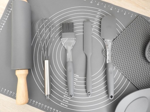 Niejako podstawą zestawu jest silikonowa stolnica. Trzeba przyznać, że jest bardzo praktyczna, elegancka, oczywiście jest odporna na zarówno niskie, jak i wysokie temperatury. Perfekcyjnie przylega do blatu oraz stołu. Na stolnicy znajduje się siedem kół / miarek, dzięki czemu można sprawniej przygotować ciasto, np. na pizzę. Może służyć jako brytfanka do wypieku ciasta, ale również jako podstawka pod gorące naczynia. Podstawka silikonowa pod chochlę żeby nie brudzić blatu. Trzepaczka-wygodna i poręczna. Podkładka pod garnek zawsze się przydaje.