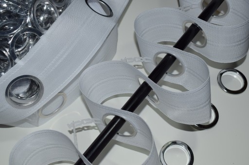 taśmę z przelotkami na zatrzask. Przelotki w kolorze srebrnym w połysku ( i tylko takie występują, nie mam innych kolorów przelotek w tej taśmie)