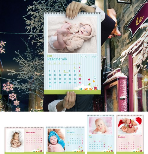 Cztery projekty (dwa pionowe i dwa poziome) o tematyce dziecięcej. Kolorowe kalendarium bez imienin ale z tradycyjnymi świętami. Możliwość zdefiniowania własnych świąt wszystkich dni w miesiącu. Miejsce na umieszczenie zdjęć rozmiaru 28 na 21 cm (w kalendarzach pionowych) lub 21 na 28 cm (w kalendarzach poziomych).
