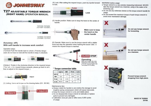 Klucze dynamometryczne Jonnesway posiadają Świadectwo Kalibracji wykonane na certyfikowanym przyrządzie pomiarowym, stanowiąc połączenie jakości i przystępnej ceny. Klucze dynamometryczne są skalibrowane z dokładnością do 4 procent wartości, co potwierdzone jest normą PN-EN ISO 6789. W trakcie pracy z kluczem zaleca się jednak jego kontrolę przynajmniej raz w roku lub co 5 000 operacji.
