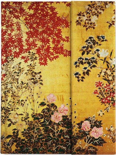 Niech piękne obrazy z natury inspirują pióra! Projekt okładki z japońskiego parawanu. Elegancka praca XVIII-wiecznej sztuki wyprodukowanej w japońskim mieście Edo, obecnie Tokio. Wizerunki drzew i roślin są wzbogacone o subtelne tłoczenia złotą folią, nadając efekt trójwymiarowy. Ten atrakcyjny notatnik posiada okładkę/klapkę zamykaną na magnes tak, aby zabezpieczyć notatki i zapiski.