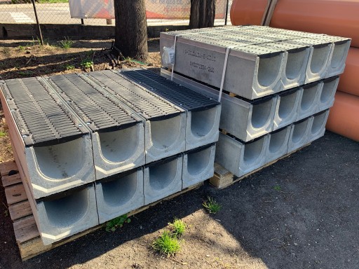 - Odwodnienie z wbudowanym odpływem dolnym Ø110: ODW VDL Koryto pol-beton/żeliwo C250 h80 odpływ