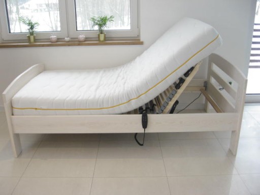Przedmiotem aukcji jest nowe łóżko ze stelażem elektrycznym oraz możliwością ustawienia PRZY MONTAŻU indywidualnej wysokości od ziemi do góry materaca w zakresie od 40 do 65 cm(nawet co 1 cm GÓRA-DÓŁ).. Nowa rama łóżka sosnowa malowana na kolor olcha.Na ostatnim zdjęciu łóżko w kolorze białym (bielone) - dostępne na kolejnych aukcjach w cenie 1949 zł. .Nowy stelaż przewodowy posiada bardzo elastyczne listewki oraz dodatkowo regulację twardości w środkowej części za pomocą regulowanych podwójnych listewek oraz nowy materac piankowy wysokości od 15 do 17 cm. Materac dwustronny z zamkiem dookoła , wykonany ze specjalnej pianki nacinanej w falę z obydwu stron (nacięcia w falę pozwalają na dobre układanie się materaca przy zginaniu się stelaża).