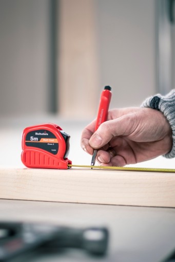 Taśma stalowa ze znakami po obu stronach do precyzyjnych pomiarów. Żółte stalowe taśma wyskalowana przy użyciu bardzo dokładnego druku atramentowego z matowym wykończeniem umożliwiającym odczyt bez odbicia. Gumowa ochrona we wszystkich punktach narażonych na uderzenia oraz obudowa wykonana z tworzywa ABS. Zintegrowany ogranicznik uderzenia dla ochrony powrotu taśmy.