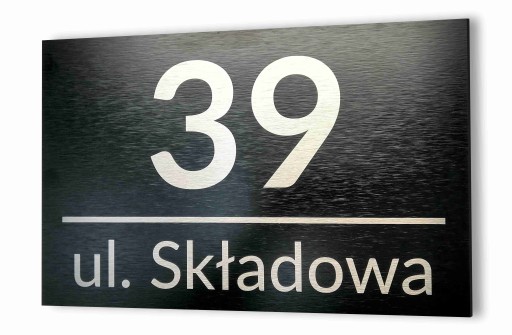 TABLICZKA ADRESOWA Z NUMEREM I NAZWĄ ULICY 32x21 cm. WYKONANA Z DIBONDU SZCZOTKOWANEGO CZARNEGO, GRAWEROWANA LASEROWO. BARDZO TRWAŁA I ELEGANCKA