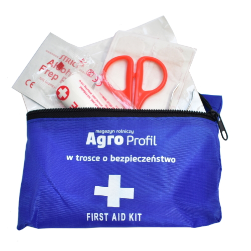 Niebieska apteczka Agro Profil w trosce o bezpieczeństwo. W środku znajduję się: pęseta, rolka plaster, bandaż w rolce, 2 jałowe opatrunki, chusteczka nasączona alkoholem, chusteczka przeciw komarom, wacik antyseptyczny, nożyczki.