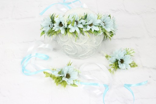 Wykonany z kwiatów rumianku w odcieniach niebieskich, z dodatkiem stylowych dekoracyjnych traw, idealnie wpisujących się w obecne trendy.