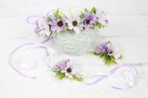 Wykonany z kwiatów rumianku w odcieniach fioletu, z dodatkiem stylowych dekoracyjnych traw, idealnie wpisujących się w obecne trendy.