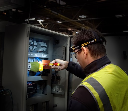 Jasna latarka czołowa Stanley Fatmax z regulowaną obrotową główką i wygodnym, obrotowym przełącznikiem, zapobiegającym przypadkowemu przełączeniu.