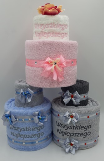 Tort urodzinowy z kompletu ręczników- to ciekawa i oryginalna forma pakowania ręczników - świetnie sprawdza się jako forma prezentu na imieniny, urodziny.