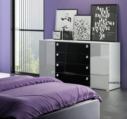 Stylowa i praktyczna komoda z szufladami oraz drzwiczkami. Wykonana z dbałością o każdy detal. Sprawdzi się zarówno w sypialni, jak i w salonie. Front z płyty na wysoki połysk w kolorze biało-czaranym, korpus biały matowy. Dzięki pojemnym szufladom oraz bocznym drzwiczkom, pozwoli na utrzymanie porządku w pomieszczeniu, a także na zaoszczędzenie miejsca w pozostałych meblach. Dostępna w szerokiej ofercie kolorystycznej na pozostałych naszych aukcjach.