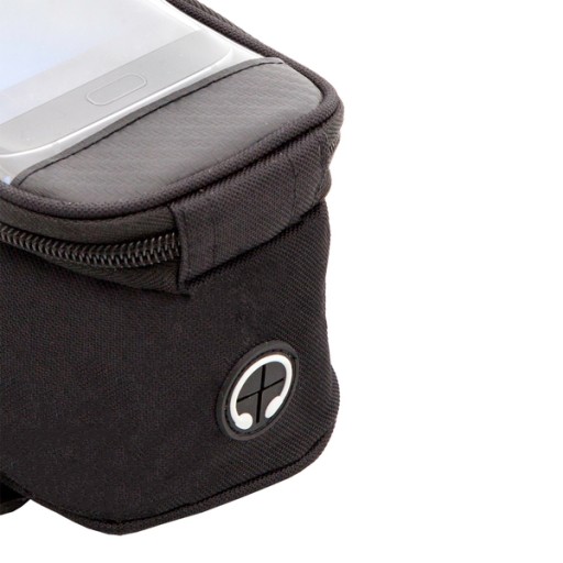 Torebka z przegródką na smartfon do zamontowania na ramę roweru. Zwiększa widoczność rowerzysty dzięki odblaskowym elementom. Umożliwia korzystanie z funkcji dotykowych telefonu przez folię. Telefon nie jest dołączony.