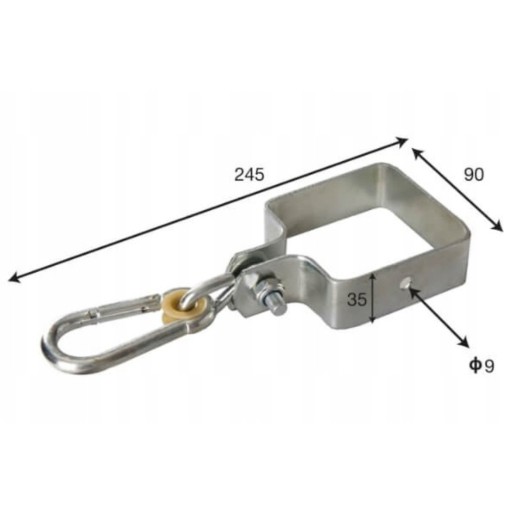 Zawiesię wykonane jest ze stali cynkowanej galwanicznie, odpornej na warunki atmosferyczne. Wyposażone jest w trwałe łożysko oraz karabińczyk do zaczepienia liny.