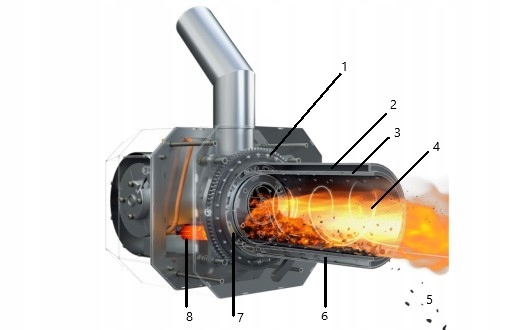 - 5- Popioły i żużle usuwane z komory spalania dzięki obrotowi i nadmuchowi