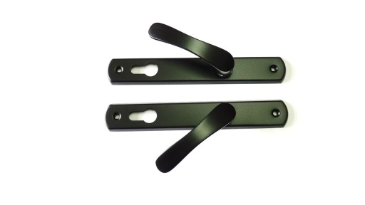 4. Klamka metalowa z szyldem o rozstawie 90 mm.