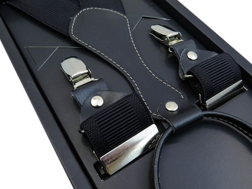 Klasyczne szelki męskie do spodni. Wykonane z doskonałej jakości gumy galanteryjnej, skóry i zapięć metalowych. Szelki wyprodukowane w Polsce, zapakowane w elegancki kartonik – idealne na prezent. Szerokość taśm wynosi mniej więcej 3,5 cm, dzięki czemu są wygodne i nie wpijają się w ciało. Szelki są zapakowane w ładne, eleganckie pudełeczko, mogą więc być miłym prezentem dla wszystkich, ale zwłaszcza dla osób, które lubią eksperymenty modowe.