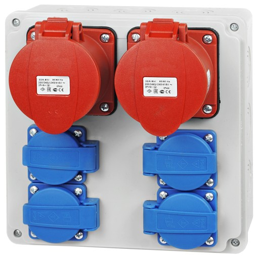 ORYGINALNA RODZIELNICA ELEKTRYCZNA, ZABEZPIECZONA, MARKI ADELID. NATYNKOWA Z DWOMA GNIAZDAMI SIŁOWYMI 32A 5P ORAZ CZTEREMA GNIAZDAMI 230V.