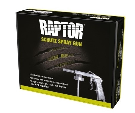 RAPTOR Schutz Spray Gun to pistolet lakierniczy stosowany to aplikacji konserwacji (baranków) oraz powłoki Raptor, zapewniając przy tym spójne wykończenie. Posiada rurkę zanurzeniową pasującą zarówno do butelek Raptor jak i Gravitex.