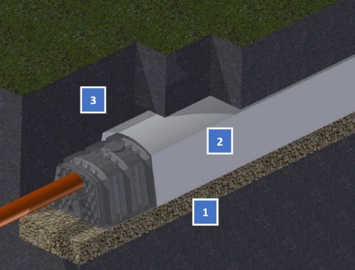 ⭐ Długość pojedynczej nitki tuneli nie powinna przekraczać 30 m. Każdą nitkę złoża należy wyposażyć w doprowadzenie powietrza – wentylację niską. Całość zasypać gruntem rodzimym (3). Dla rozsączania wody deszczowej warstwa wspomagająca nie jest wymagana.