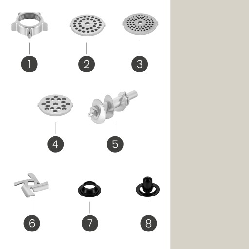 - Bogaty zestaw akcesoriów – 3 dyski o różnej wielkości oczek, 4 nakładki do szatkowania warzyw, akcesoria masarskie, nakładka kebbe