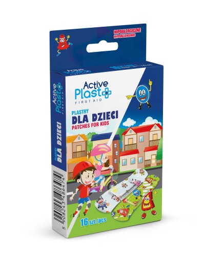 Opakowanie zawiera 16 kolorowych plastrów z nadrukiem (dwa wzory), co stanowi zabezpieczenie podczas chociażby dłuższego wyjazdu.