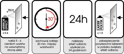 UWAGA farba w sprayu Mirror Effect nie zatuszuje ubytków, szczególnie na powierzchniach lustrzanych, jak też nie ukryje zniszczeń. Nie pokrywać rzeczy ocynkowanych. Również NIE pokrywać przedmiotów, które poddawane są wysokim temperaturom (200º C) Nakładać na tylną / przeciwną stronę szkła.