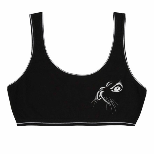 Śliczny zestaw 5 sztuk biustonoszy w klasycznej, czarnej kolorystyce. W zestawie staniki z pięcioma różnymi nadrukami kota. Produkty oferowane przez LILLY BLING są świetnej jakości. Bielizna wykonana z wysoko gatunkowej bawełny, miękkiej, praktycznej, niecisnącej! Idealna na zajęcia sportowe jak również na co dzień.