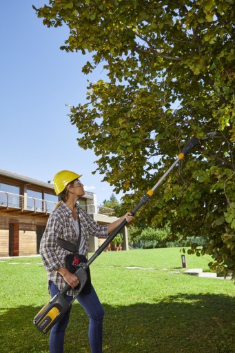 ⭐ Po co ryzykować wspinaniem się i pracą na wysokościach, gdy pilarka na wysięgniku SPS 700 tnie na wysokości do 2,70 m (razem z wysokością operatora pozwala osiągnąć do ok 4m). Napędzana potężnym akumulatorem 48 V 4 Ah i silnikiem 450 W, 25 cm listwa tnąca SPS 700 gładko przecina liście przez 30 minut na jednym ładowaniu. dla jeszcze łatwiejszej obsługi wysokowydajny łańcuch pilarki minimalizuje odrzuty. Jest również wygodny, z ergonomicznym, miękkim w dotyku, gumowym uchwytem i trzonkiem oraz zaczepem do uprzęży, co zapewnia pracę bez wysiłku. Aby zapewnić bezpieczne, wygodne i precyzyjne cięcie, SPS 700 jest wyposażony w zderzak, który umożliwia oparcie się o gałęzie podczas pracy .