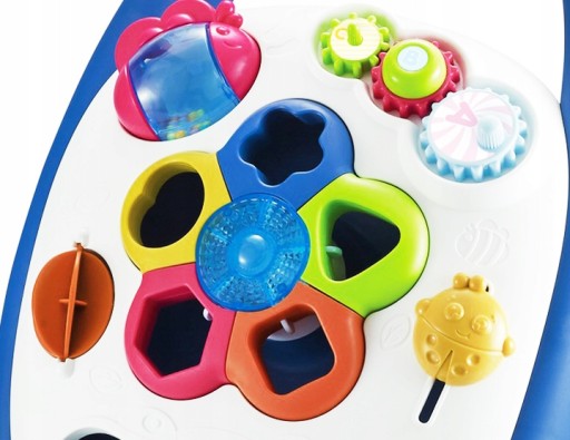 INTERAKTYWNE CENTRUM ZABAW. Nauka chodzenia będzie fascynującą zabawą z naszym solidnym, interaktywnym chodzikiem. Jest to prawdziwe mobilne centrum zabaw ze światłem i dźwiękami. Maluch może uruchamiać dźwięki i światło na panelu przednim poruszając różnymi elementami oraz wrzucając klocuszki w odpowiednie kształty.