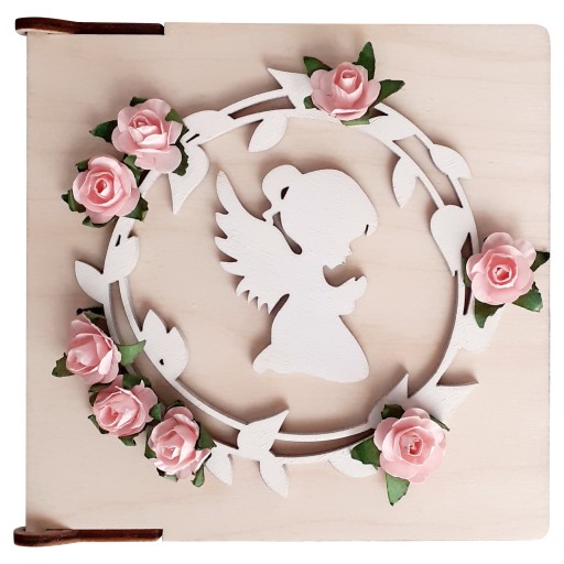 Podziękowanie wykonane jest ze sklejki o grubości 3mm. Napisy dedykacji są grawerowane laserem. Aniołek i wianek są malowane farbą akrylową.