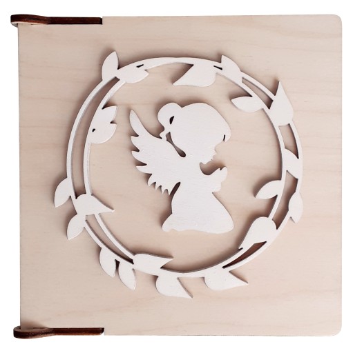 Podziękowanie wykonane jest ze sklejki o grubości 3mm. Napisy dedykacji są grawerowane laserem. Aniołek i wianek są malowane farbą akrylową.