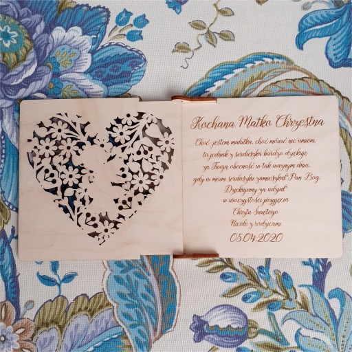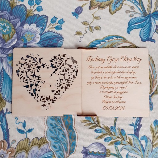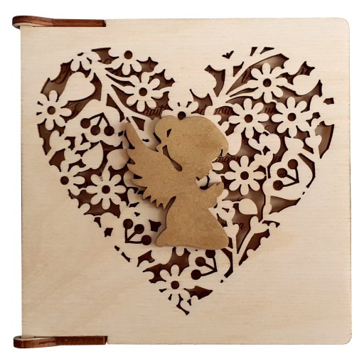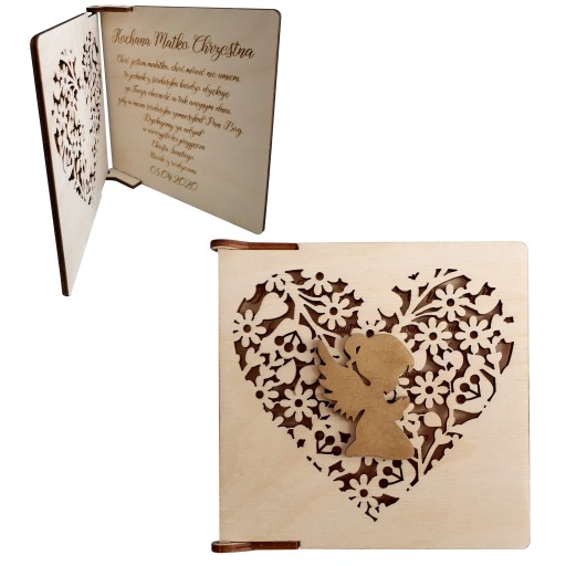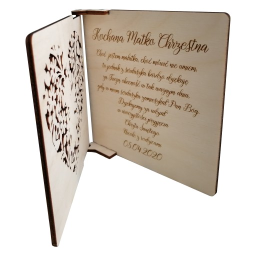 Podziękowanie wykonane jest ze sklejki o grubości 3mm. Napisy dedykacji są grawerowane laserem. Aniołek jest malowany farbą akrylową.