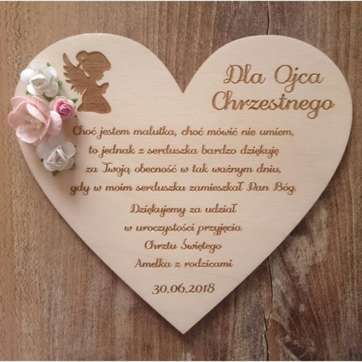 Podziękowanie wykonane jest ze sklejki o grubości 3mm. Kwiatki papierowe (kwiatki mogą się nieznacznie różnić od tych pokazanych na przykładowych podziękowaniach na zdjęciach). Napisy i kształt aniołka są grawerowane laserem. Wymiary podziękowań - wysokość 135mm, szerokość 150mm.