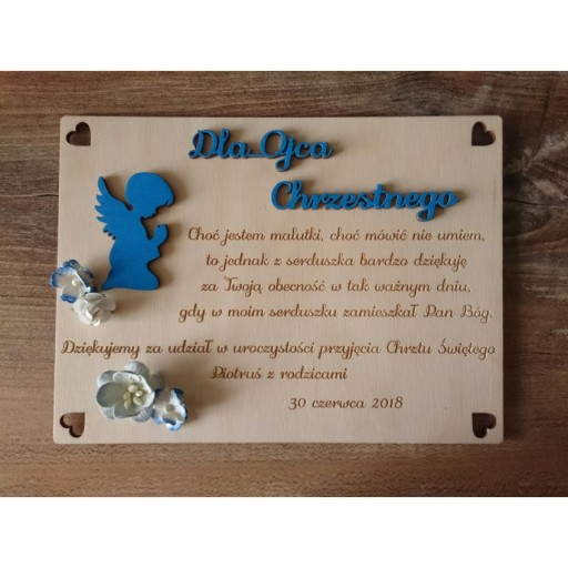 Podziękowanie wykonane jest ze sklejki o grubości 3mm. Kwiatki papierowe (kwiatki mogą się nieznacznie różnić od tych pokazanych na przykładowych podziękowaniach na zdjęciach). Napisy dedykacji są grawerowane laserem, Napis dla kogo jest podziękowanie oraz aniołek są wycinane ze sklejki i malowane farbą akrylową. Wymiary podziękowania - wysokość 140mm, szerokość 190mm.