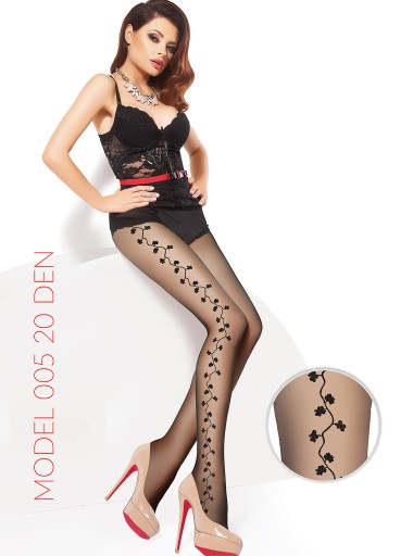 Szykowne rajstopy ozdobione fantazyjnym wzorem kwiatowym z boku nogi.