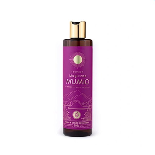 Szampon z mumio i olejkiem geraniowym, na bazie serwatki mlecznej, na porost włosów oraz do wrażliwej skóry głowy.