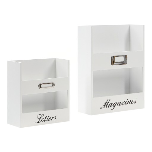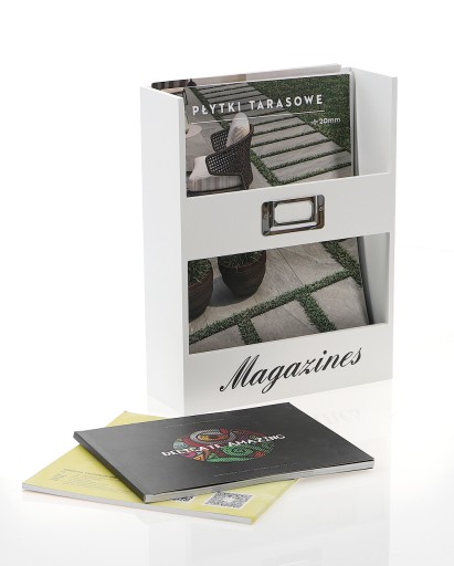 Drewniany, duży organizer na czasopisma. Model MAGAZINES. Kolor biały, styl skandynawski. Możliwość powieszenia idealny do organizacji prasy np. w poczekalniach.