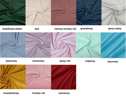 Do wyboru kolor szary, butelkowa zieleń, beż, brudny róż, granatowy, miętowy, niebieski, wrzosowy, jasny róż, musztarda, ciemny brudny róż, czerwony, lazurowy.
