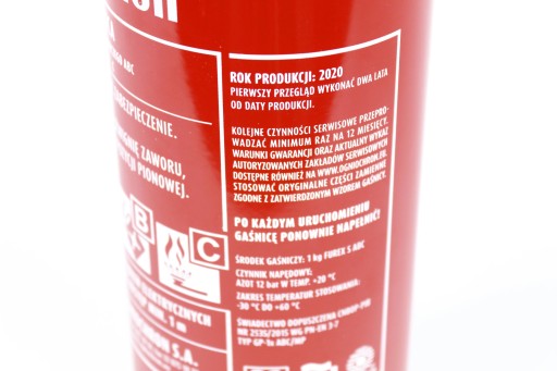 - Zbiornik gaśnicy pokryty farbą poliestrową odporną na promienie UV.