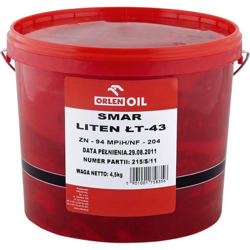 Informacje techniczne Smary Liten ŁT-43 otrzymywane są przez zagęszczenie rafinowanego oleju mineralnego mydłem litowym i uszlachetniane są pakietem dodatków o działaniu przeciwutleniającym, przeciwrdzewnym i smarnym. Smar Liten ŁT-43 odporny jest na działanie wody. Smary plastyczne Liten ŁT-43 stosuje się do smarowania łożysk tocznych i ślizgowych.
