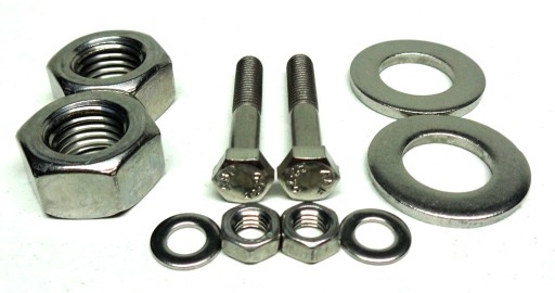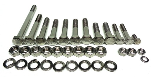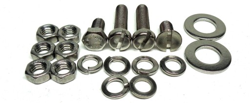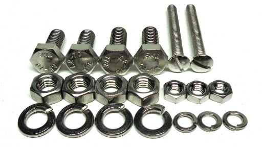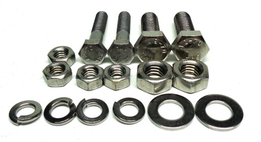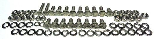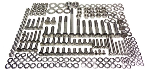 Komplet złożony jest z chromoniklowych elementów nierdzewnych wykonanych w klasie A2. W skład kompletu wchodzą śruby, wkręty, nakrętki i podkładki podzielone na 14 osobno spakowanych grup, umożliwiających bezproblemowy montaż poszczególnych elementów motocykla.