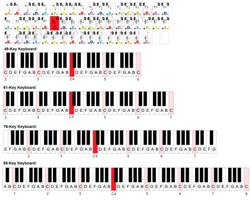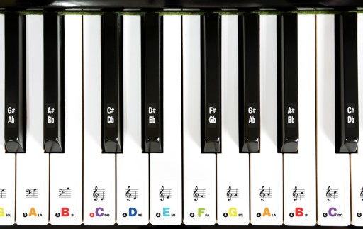 Etykiety pasują do każdego pianina od najmniejszych po 88 klawiszy. W notacjach stosuje się na świecie C-D-E-F-G-A-B lub w części europy C-D-E-F-G-A-H czyli zamiast H jest B i odwrotnie w różnych zapisach nutowych. - Warto pamiętać
