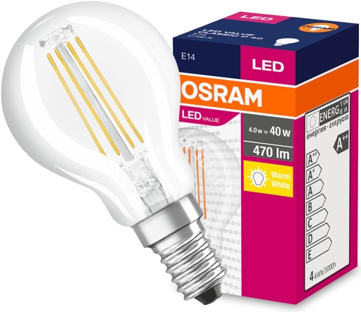 Żarówka LED FILAMENT serii VALUE renomowanej i uznanej w branży oświetleniowej firmy OSRAM. Żarówka wyposażona w gwint E14 oraz mocy 4W ( odpowiednik tradycyjnej żarówki o mocy 40W), emituje strumień świetlny na poziomie 470lm. Żarówka LED wyposażona w przezroczyste szkło, pięknie komponuje się, z każdą oprawą. Jej klasyczny wygląd sprawi, że Twoje gniazdko nabierze przytulnego charakteru, a wzrok odpocznie przy ciepłym, przyjemnym dla oka świetle o temperaturze barwowej 2700K.