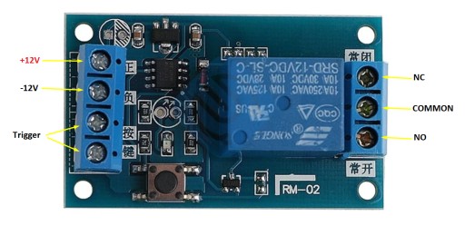 Po kliknięciu przycisku naprzemiennie przełącza się stan przekaźnika (włączony/wyłączony). Sygnał sterujący wyprowadzony został także na złącza śrubowe Trigger.