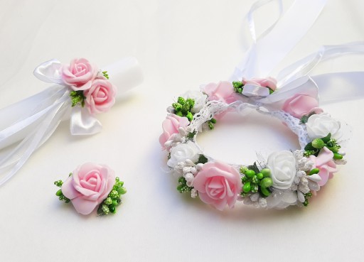Wianek wykonany jest z różyczek piankowych i dodatków florystycznych. Kwiaty wyglądają bardzo realistycznie sprawiając, że dziewczynka będzie wyglądała delikatnie i elegancko w dniu Komunii Świętej.